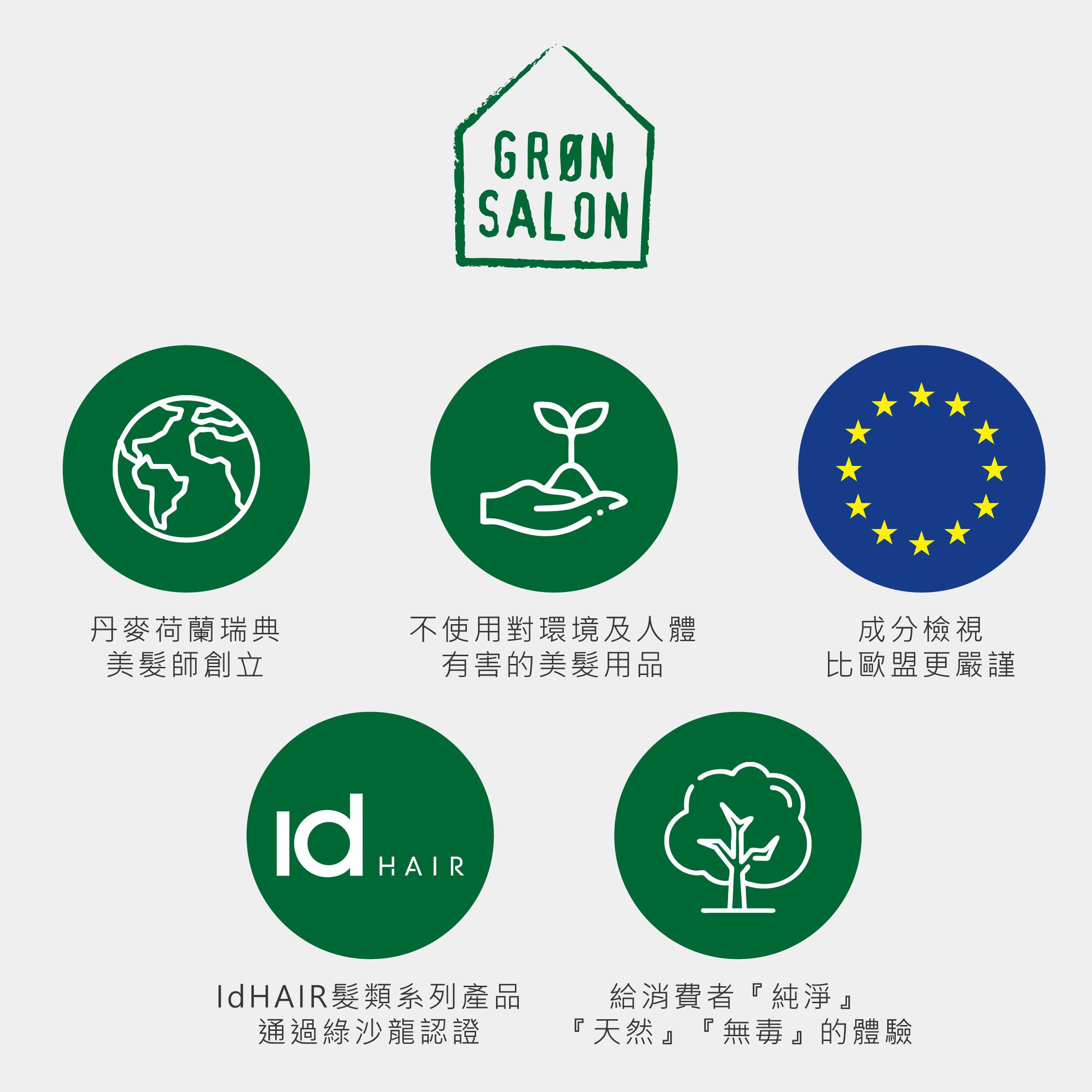 Id HAIR 產品皆於丹麥設計研發 ,瑞典製造同時也將環境保護的訴求融入在設計、研發製造與配送的過程降低對環境最低的傷害,教育更多人對環保的意識概念,讓地球環境與人類能夠並存和經營,系列商品通過歐盟“綠沙龍認證”,給頭髮最健康的品質呵護。