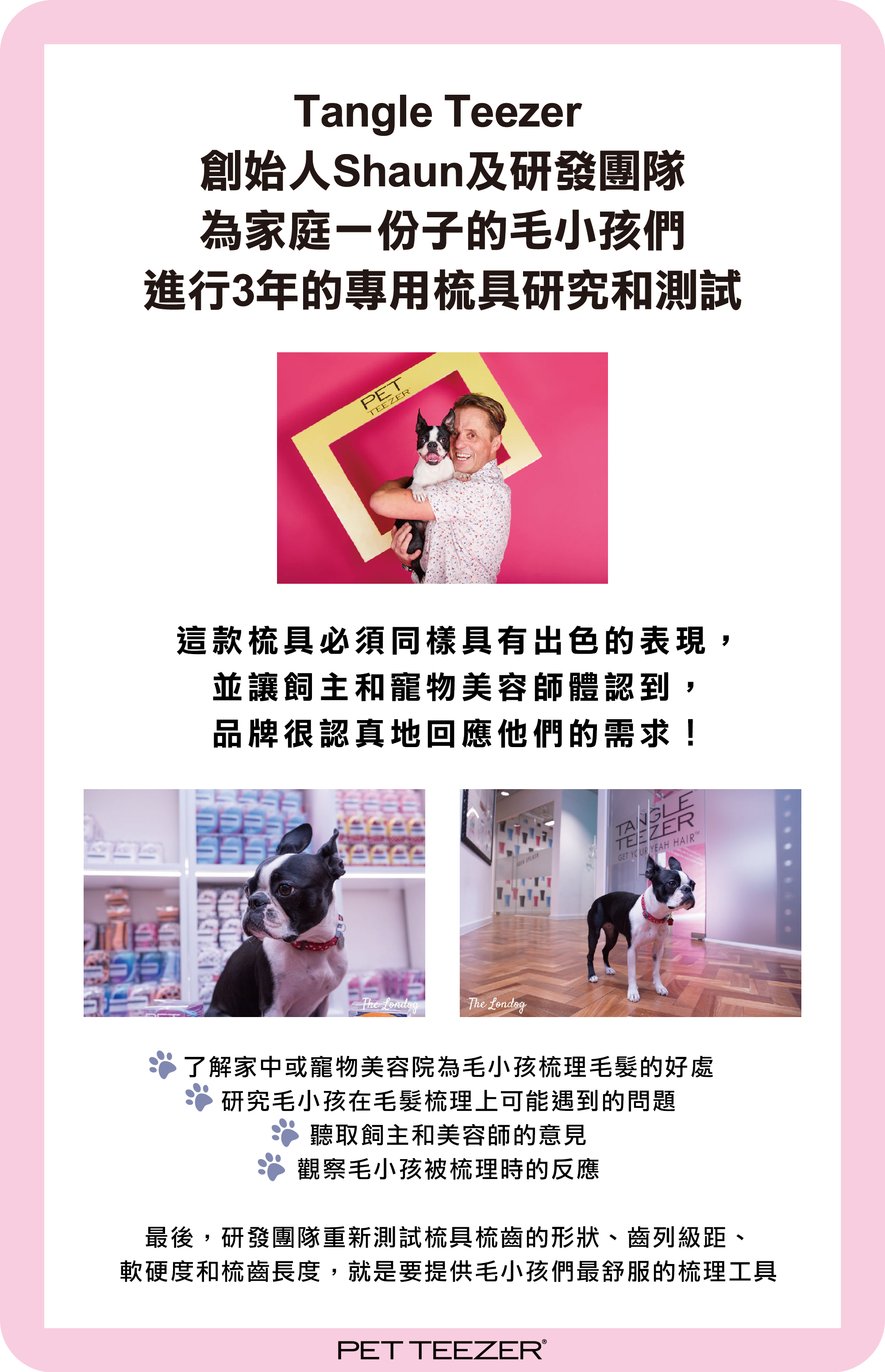 研發團隊初步先了解在家中或寵物美容院為毛小孩梳理毛髮的好處。同時研究毛小孩在毛髮梳理上可能遇到的問題,也聽取飼主和美容師的意見,以及觀察毛小孩被梳理時的反應。最後,研發團隊重新測試梳具梳齒的形狀、齒列級距、軟硬度和梳齒長度,就是要提供毛小孩們最舒服的梳理工具。