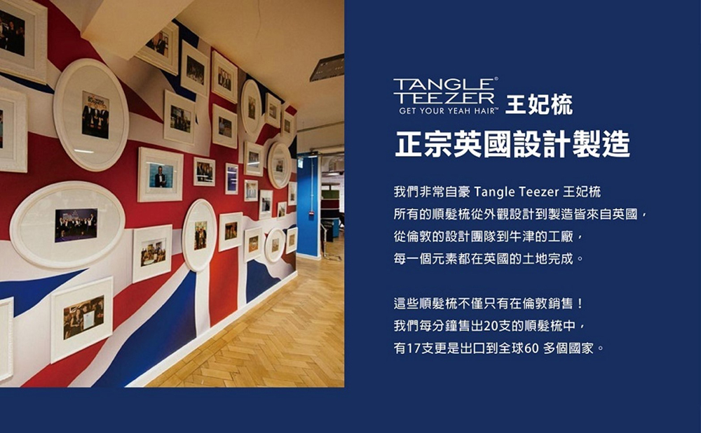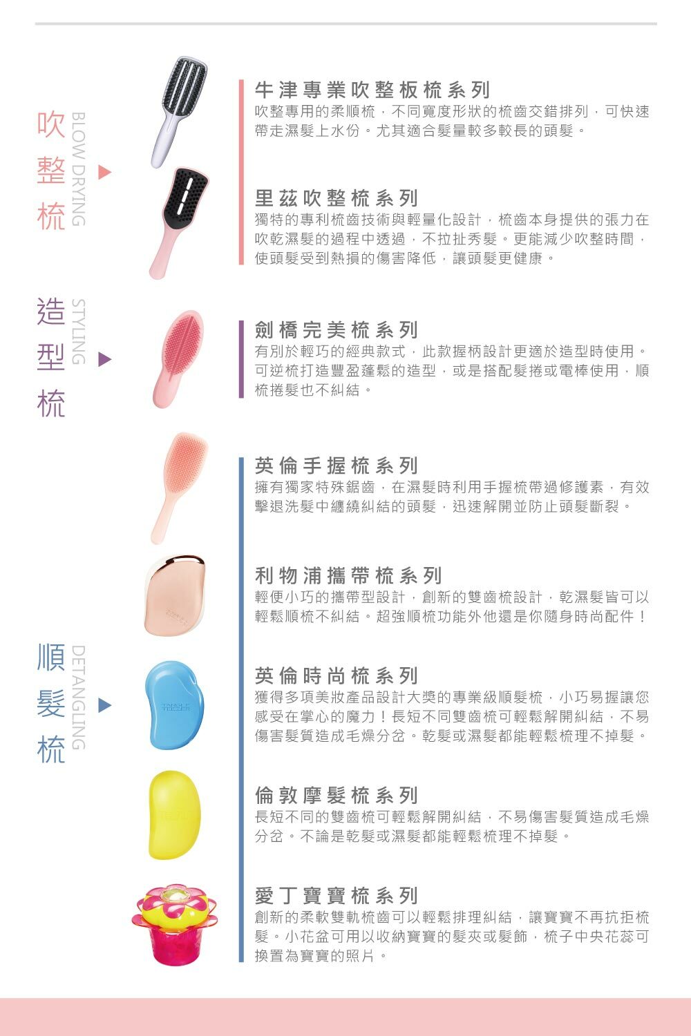英倫時尚梳系列:獲得多項美妝產品設計大獎的專業級順髮梳,小巧易握讓您感受在掌心的魔力!長短不同的雙齒梳可輕鬆解開糾結,不易傷害髮質造成毛燥分岔。不論是乾髮或濕髮都能輕鬆梳理不掉髮。