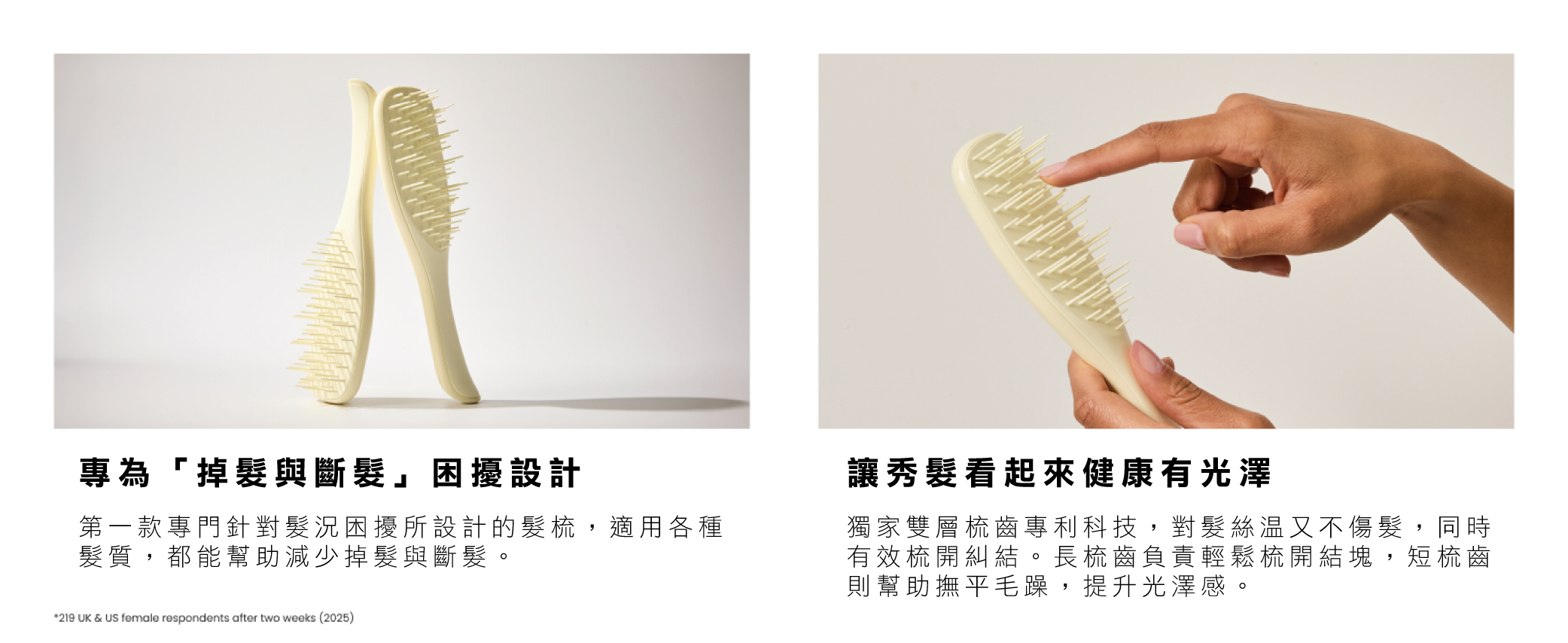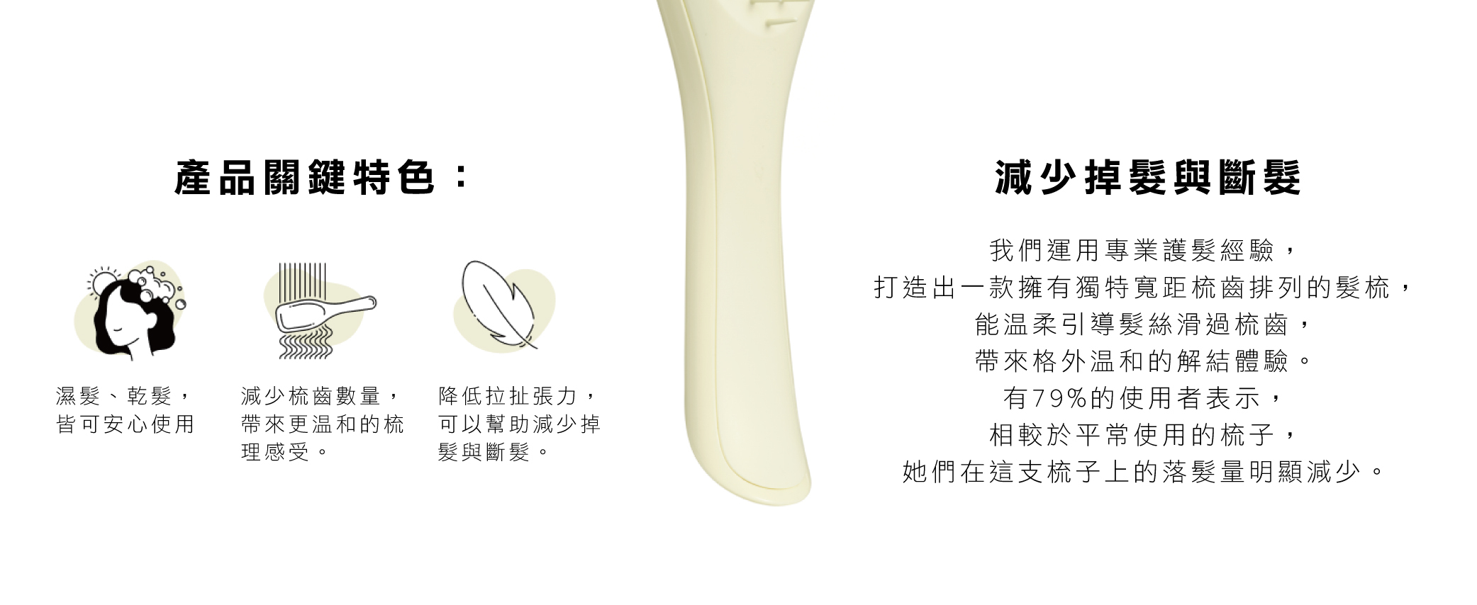 獨特的梳齒排列設計,降低拉扯張力,有效減少掉髮與斷髮,讓你梳髮更有自信。