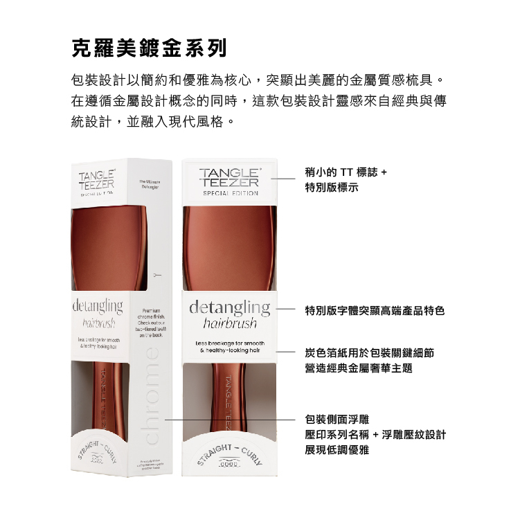 克羅美鍍金系列,將時尚金屬美學與專業梳理技術完美結合。獨特的握柄即使濕手也不滑落,輕鬆滑過髮絲,帶來順暢體驗。