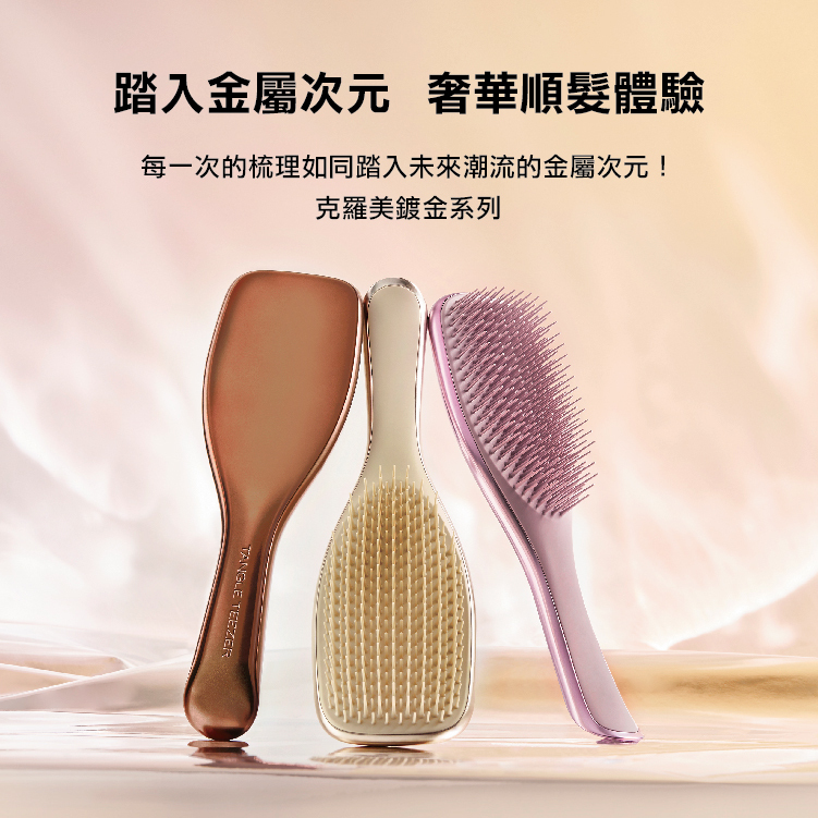 克羅美鍍金系列,將時尚金屬美學與專業梳理技術完美結合。獨特的握柄即使濕手也不滑落,輕鬆滑過髮絲,帶來順暢體驗。