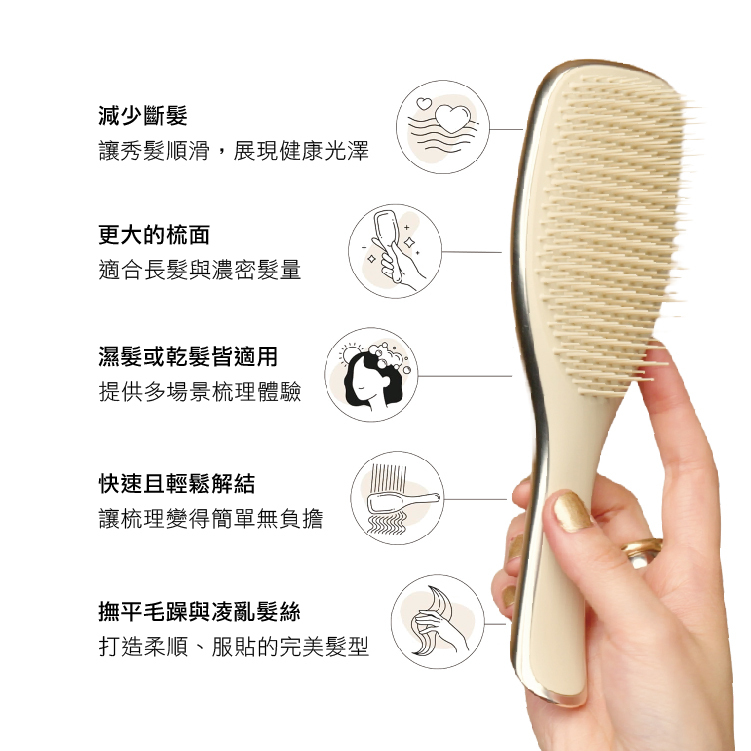 融合時尚金屬美學與專業梳理技術,專利雙層齒設計溫柔呵護剛洗完的脆弱髮絲,減少斷裂,快速解開糾結。