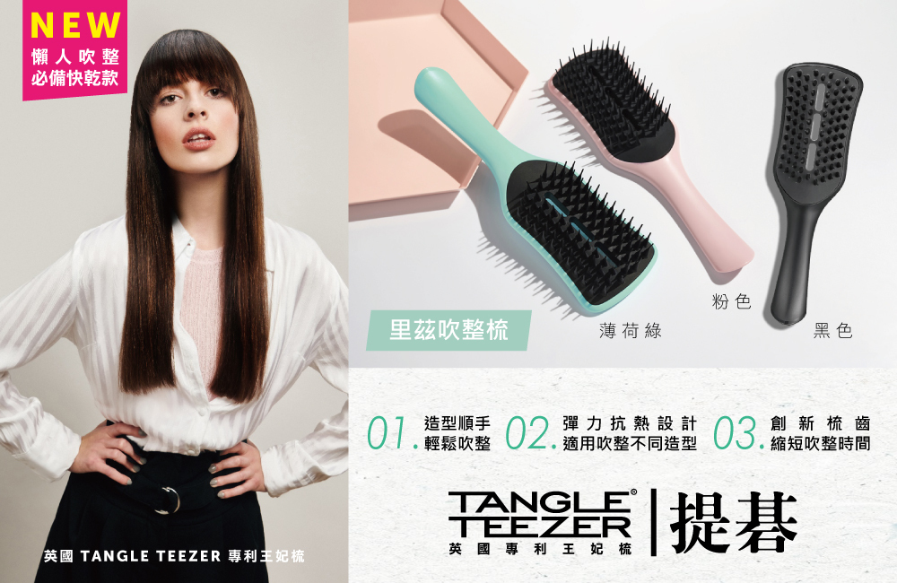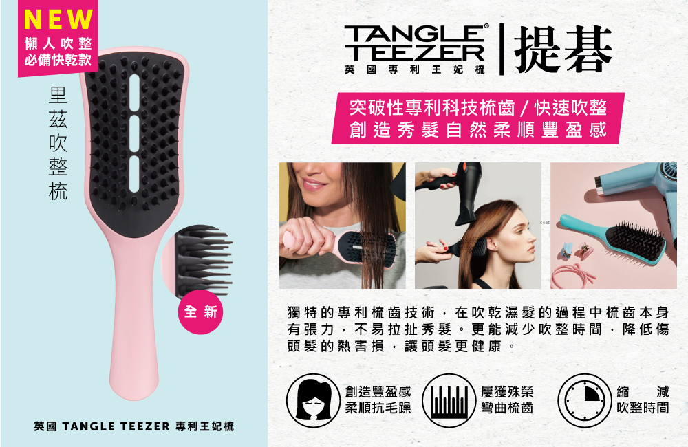 里茲吹整梳系列:獨特的專利梳齒技術與輕量化設計,梳齒本身提供的張力在吹乾濕髮的過程中透過,不拉扯秀髮。更能減少吹整時間,使頭髮受到熱損的傷害降低,讓頭髮更健康。