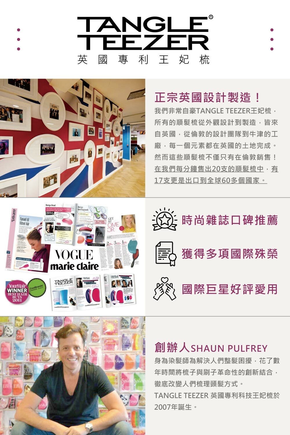 英倫時尚梳系列:獲得多項美妝產品設計大獎的專業級順髮梳,小巧易握讓您感受在掌心的魔力!長短不同的雙齒梳可輕鬆解開糾結,不易傷害髮質造成毛燥分岔。不論是乾髮或濕髮都能輕鬆梳理不掉髮。