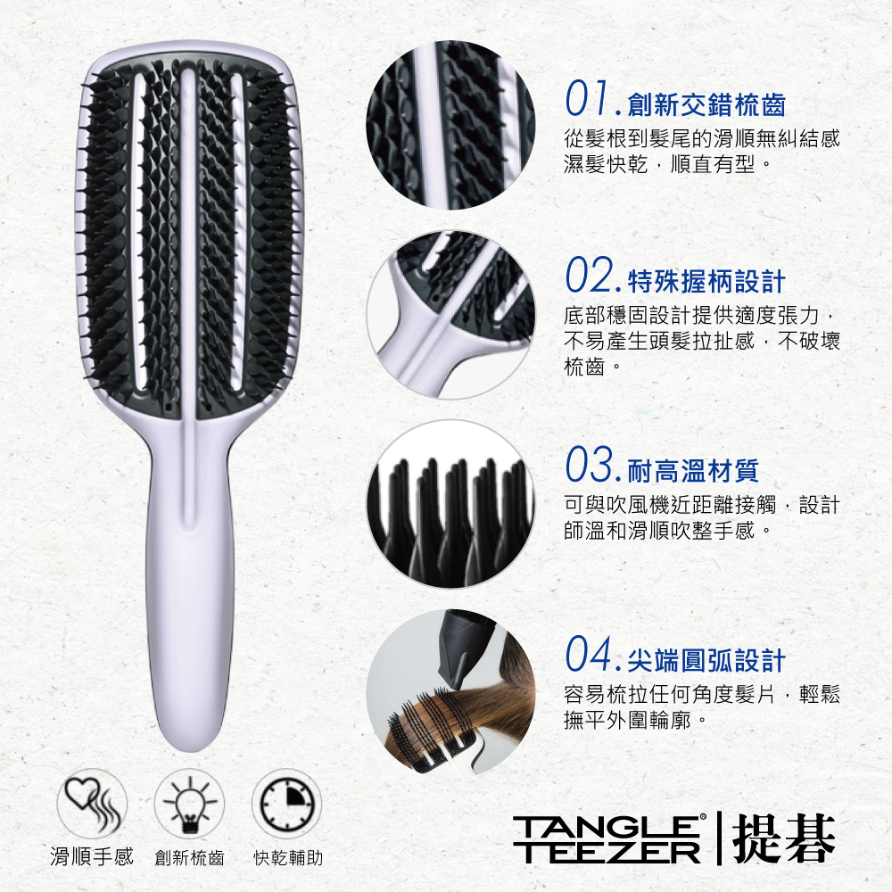 里茲吹整梳系列:獨特的專利梳齒技術與輕量化設計,梳齒本身提供的張力在吹乾濕髮的過程中透過,不拉扯秀髮。更能減少吹整時間,使頭髮受到熱損的傷害降低,讓頭髮更健康。