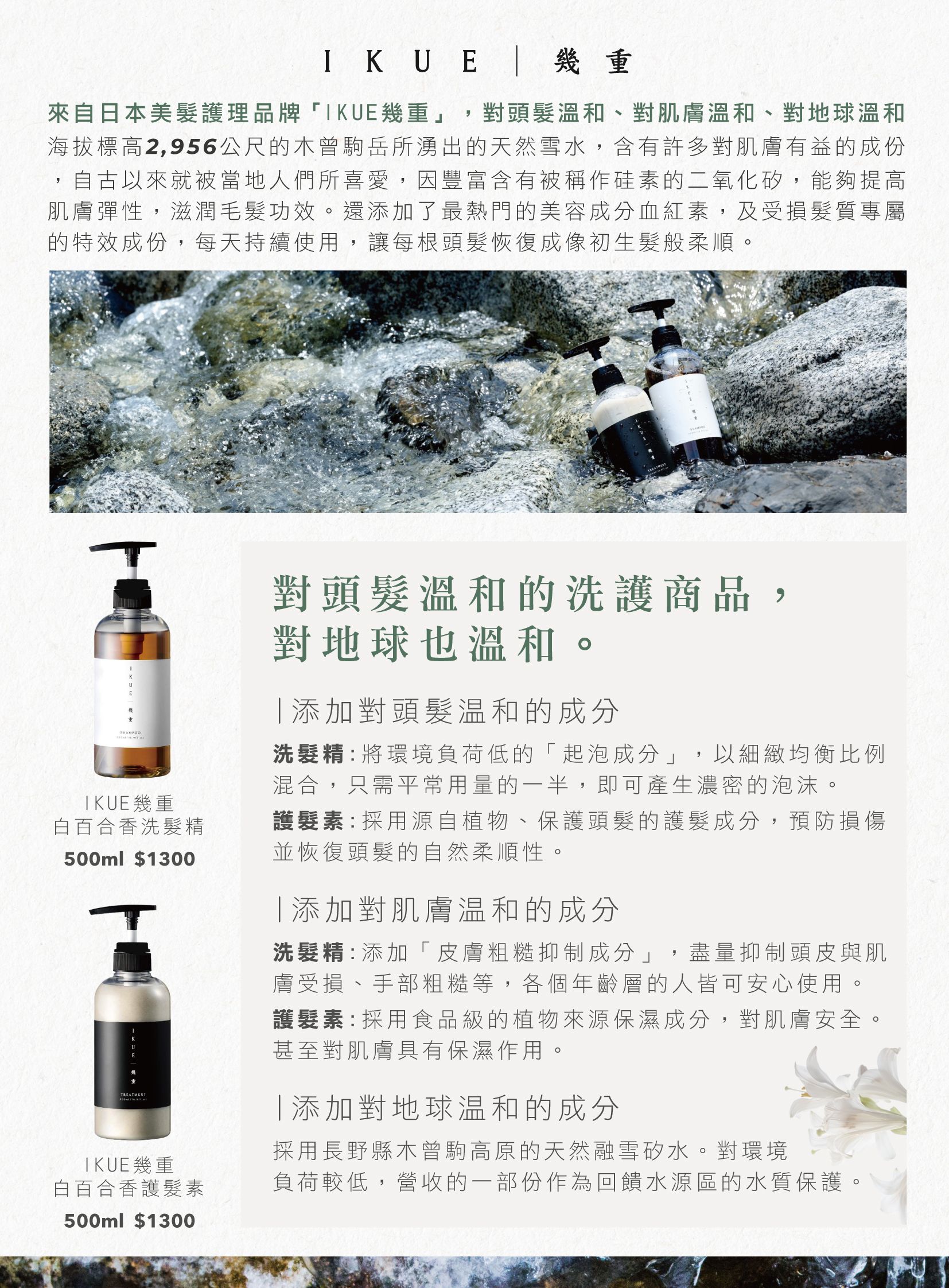 商品簡述: 白百合香護髮素500ml 採用源自植物、保護頭髮的護髮成分,預防損傷並恢復頭髮的自然柔順性。